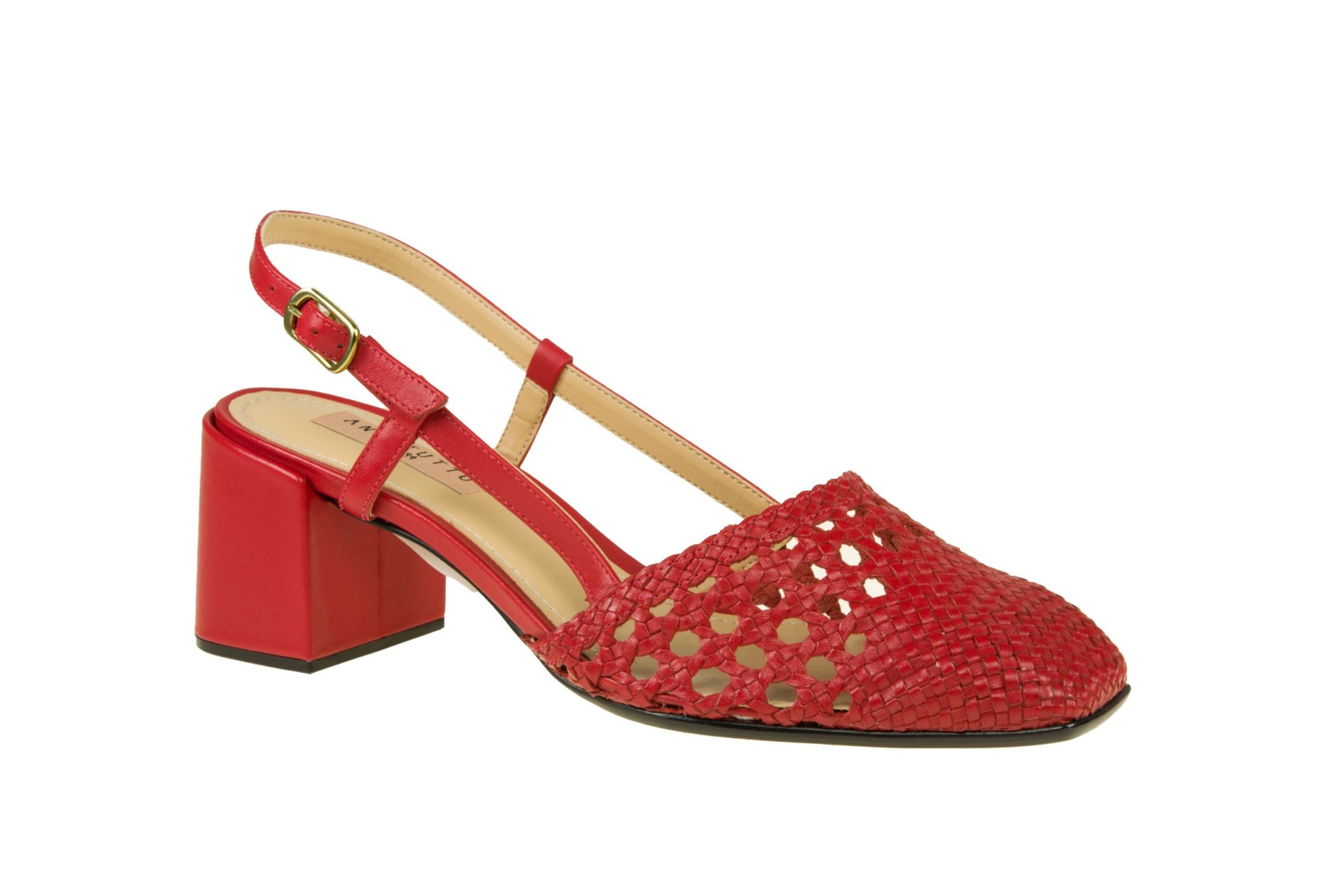 modelo de sandália de REF: 54055 tem uma gaspea tranada com colarinho forrado com tiras do traseiro com bordas superiores viradas e inferiores afio com fivela de 10 mm
