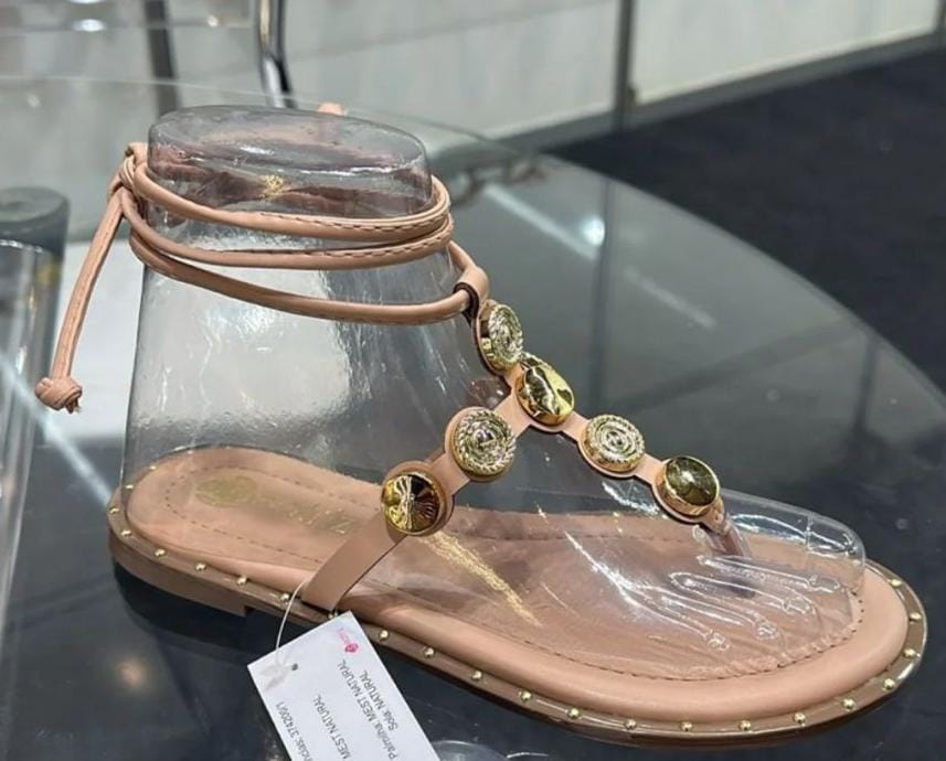 sandália rasteira com sistema de corte e recorte com metais e amarrada no traseiro